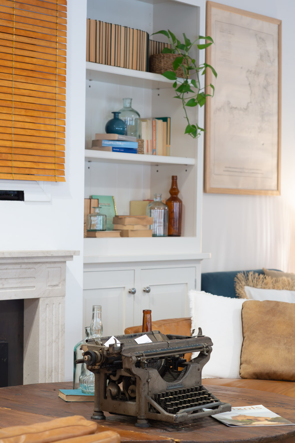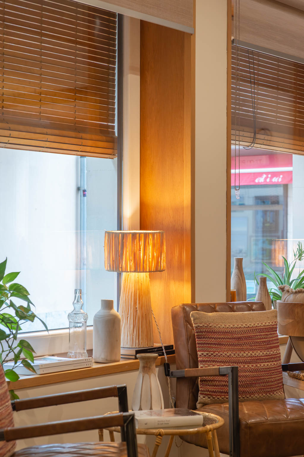 Terrace with plants, books, and a lamp.